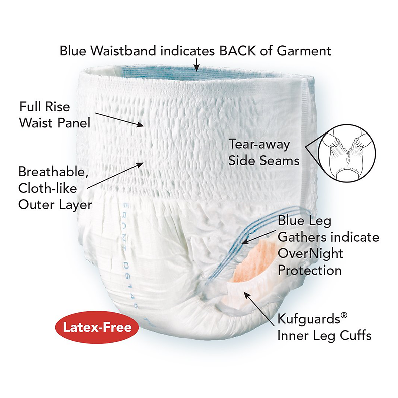 - Premium OverNight Disposable Absorbent Underwear (sometimes called pull-on or pull-up diapers) are designed for maximum levels of incontinence (20 oz to 34 oz capacity varying by size) allowing wearer uninterrupted sleep or confidence during long airplane flights